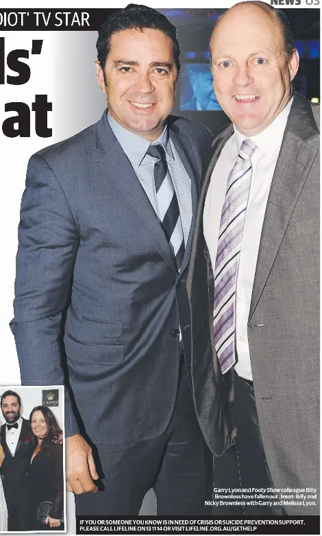 AFL great Billy Brownless quits after 27 years on Footy Show including love split over Garry Lyon. AFL great Billy Brownless stops after 27 years on Footy Show including love divided over Garry Lyon.